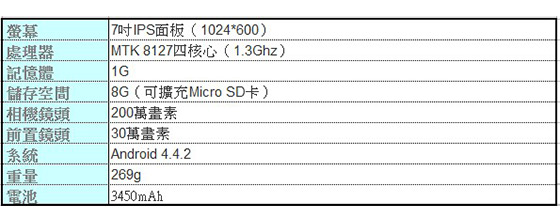 處理器:聯發科MT8127四核心處理器(1.3Ghz)