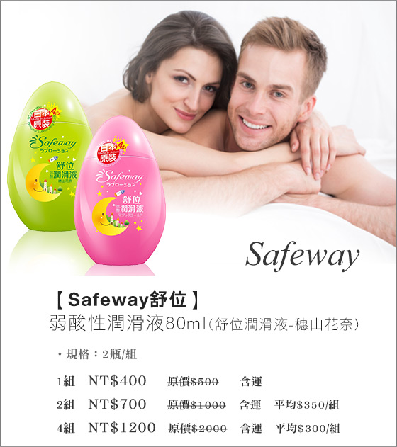 經調查發現,女性私密部位的PH值為微弱酸性3.2-4.5,【Safeway舒位】弱酸性潤滑液除了一般潤滑液的滑嫩作用之外,更可保護妹妹部位不受刺激,水溶性配方潤滑不黏膩,讓親密關係更為緊密,享受更愛上彼此的最佳證明!